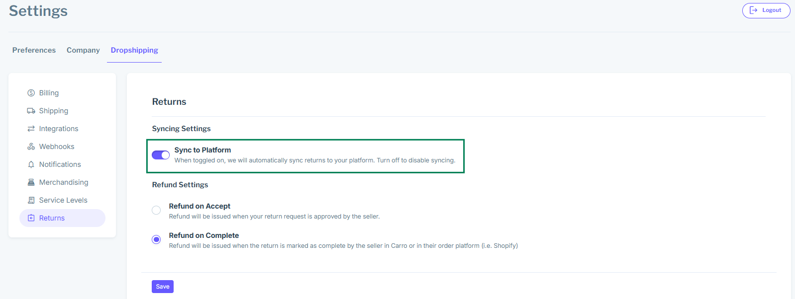 If you are integrated with Shopify, you will have the option set to sync returns to your platform turned on by default. This means that refunds requested by your partner will sync through to your Shopify Admin, and you can mark them as complete from there. This setting is available in the Returns section of the Settings.