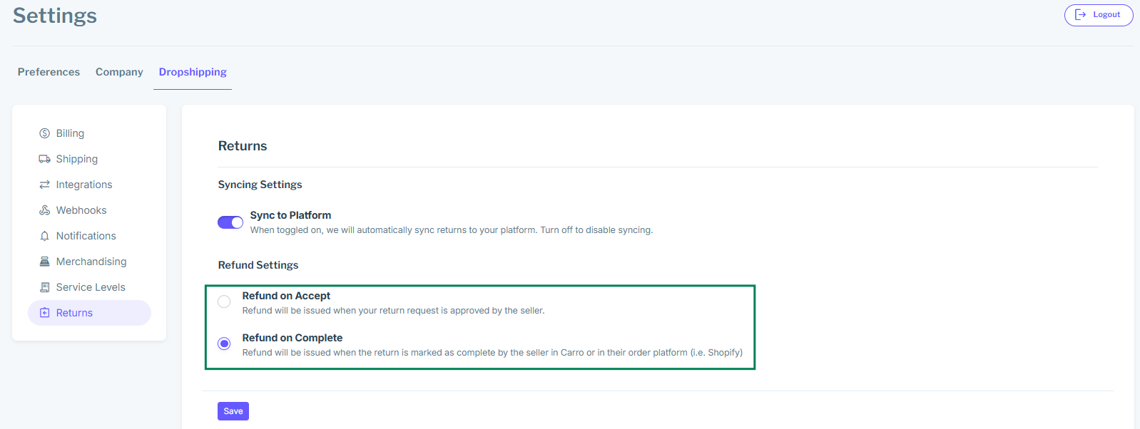 Refund setting - This setting will control when your customer gets a refund for the funds transacted through your ecommerce checkout. You can choose to either refund the order total to your customer when the return is accepted or completed by your partner.