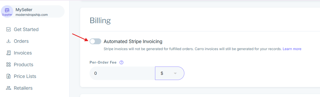 By default, Carro Now Powering Modern Dropship performs automated invoicing for fulfilled orders through Stripe (more info on billing here). However, there are cases when a retailers might not want such automated invoicing. We provide the ability to turn invoicing on and off based on your retailers needs.