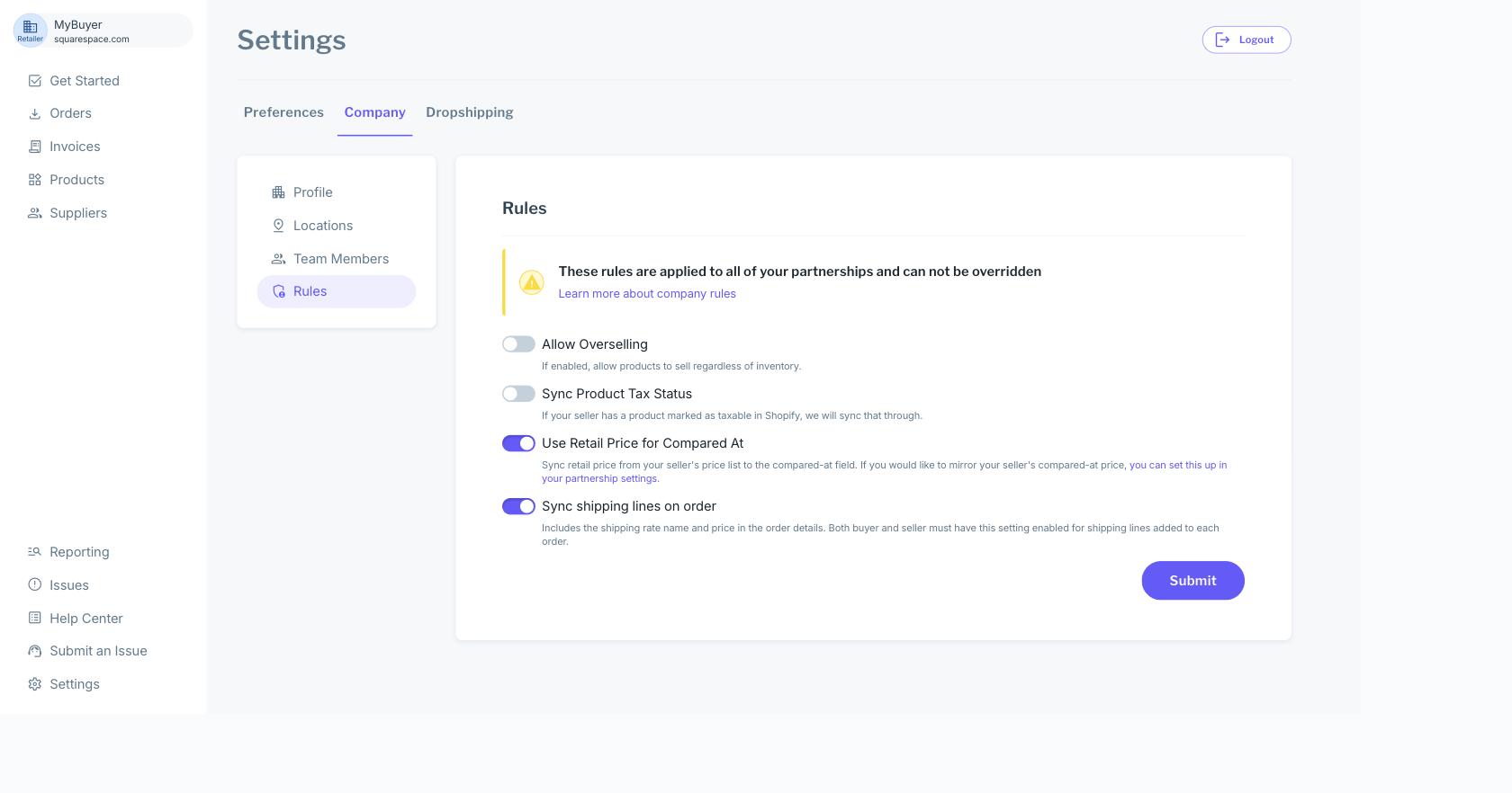 In order to allow for flexibility on certain settings, Carro Now Powering Modern Dropship has rules that can be customized at both the company and partnership level to assist with ensuring data is synced correctly for each partner. Retailers will manage the majority of these rules, but some are available to the supplier as well.