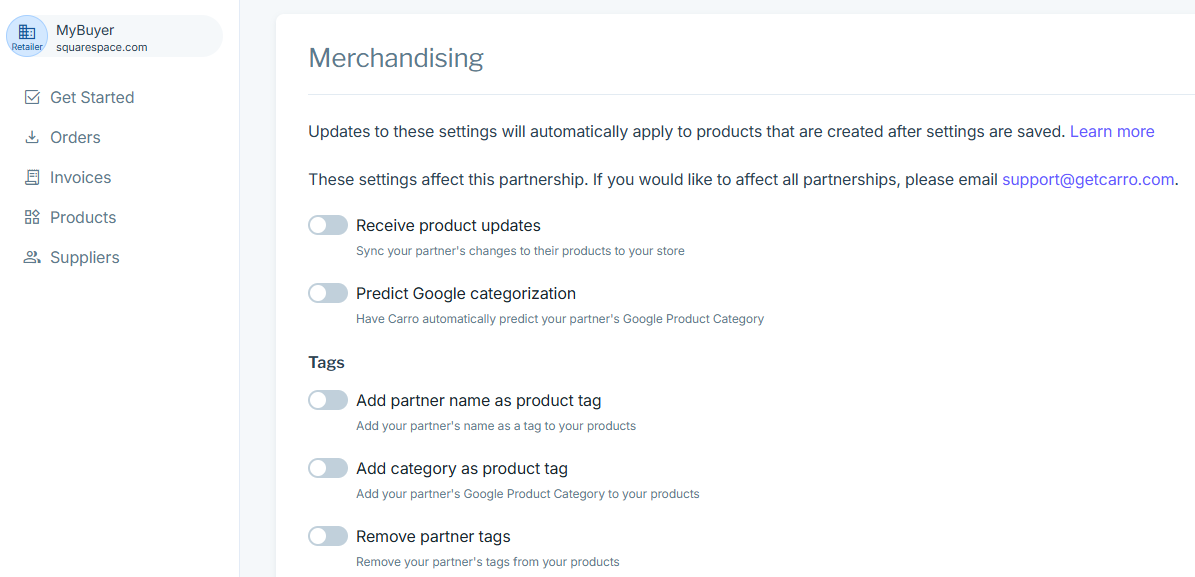 To turn on any autonomous merchandising features for all of your partners, please reach out to support@moderndropship.com. Retailers can also set some rules for individual partnerships through the Suppliers tab of Carro Now Powering Modern Dropship.