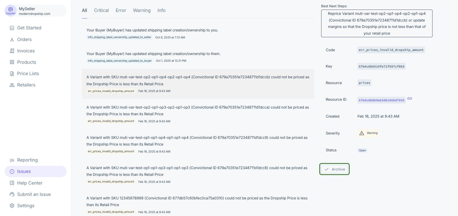 Instructions to resolve each error will be given on that issue. Once an error has been handled, you can mark it as archived using the option shown below:
