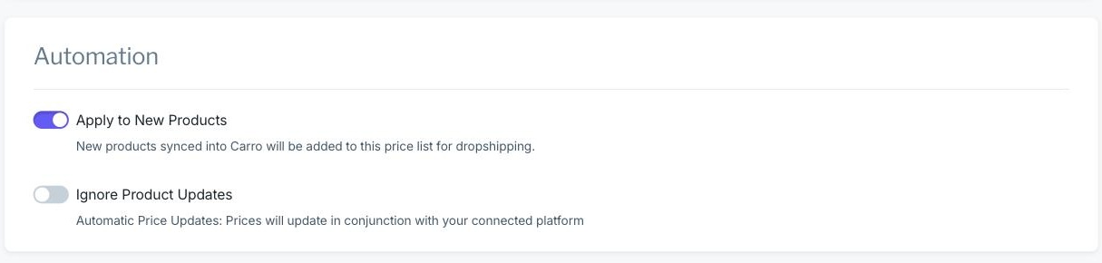 There are two important settings which make updates to your pricelists. To access these click the pricelist you want to edit > Settings > Automation (bottom).